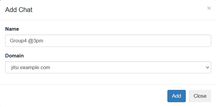 When clicked a form will be presented in a modal window where you fill in a title for the call and select the jitsi service that will host the actual video call. Instructions for adding jitsi services can be found in the Environment variables part of the installation documentation.