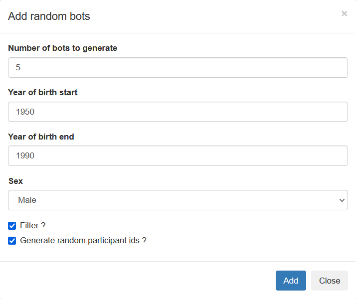 - Generate random participant ids (If checked the application will add some random alphanumeric numbers to the botnames)